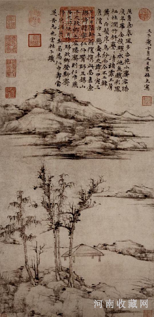 倪瓒(130l~1374年),中国元代画家。元四家之一。原名珽,字元镇,号云林,别号幼霞生、荆蛮民、奚元朗、净名居士、朱阳馆主等,常州无锡梅里祗陀村(今江苏省无锡市梅里镇)人。生于元成宗大德五年正月十七日(1301年2月27日)卒于洪武九年十一月十一日(1374年12月25日)。倪瓒出身江南富豪,雄于资财,祖父倪椿、父倪炳、兄倪文光都是大地主兼商人,又是道教徒,祖父任道录官,兄为受元朝封赠的道教首领。倪瓒早年丧父,由兄抚养长大,亦信奉道教。元文宗天历二年(1329年)文光去世,倪瓒继承父兄家业,亲自理家“出应门户”。至正(1341~1368年)年间,江南灾荒连年,义军四起,元政府强征暴敛,局势动荡不安。倪瓒为逃避官租和义军,遂散其家资,遁迹于五湖三泖间,往来宜兴、常州、吴江、湖州、嘉兴、松江一带,栖居村舍、寺观达20年之久,寄情山水诗画。明洪武初年,江南秩序安定,返回故里,寄住在亲戚邹性高家,倪瓒性情孤僻狷介,爱洁成癖,故世人称他为“倪迁”。