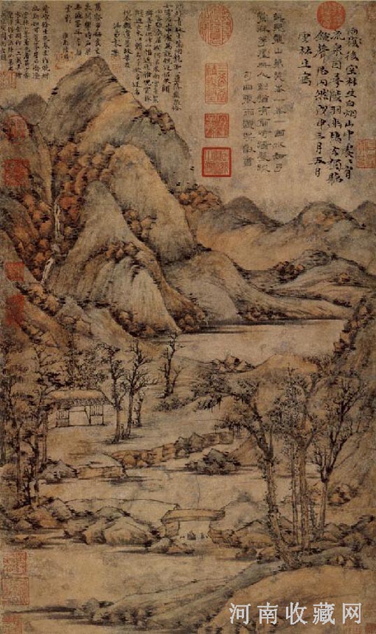 这幅设色山水画是故宫博物院所藏倪云林画中唯一的设色画。构图比较复杂,加上自己的题识与别人的跋语,几乎把全幅填满。题跋中间,唯一空隙又盖上了乾隆和宣统四颗印。图中寂然不见一人,所以叫做「雨后空林」。诗塘上有明人董其昌的跋语:「云林设色山水,平生推两幅,一在娄水王敬美家,后归乌程潘氏,余未之见;其二即此幅。」李日华却说:「倪云林著色山水,余见五六幅,各有意态。」两说虽然不同,但云林很少绘彩色山水,却是人所共知的。倪瓚襟怀高旷,对人生事物的看法,与人不同,他说:「生死穷达之境,利名毁誉之场,自其拘者?盖有不胜悲者;自其达者?殆不值一笑也。何则?此身亦非吾所有,况身外事哉。」云林家富,所居清閟阁,藏书画奇珍,闻名远近。至正初年,弃家外出,?其漂泊生活。有人说他预知天下将大乱,有先见之明;也有人说他痛恨当时的苛捐杂税,民间困苦,离家出走以避苛政。他是元季四大家之一。作画祗署名不盖章。