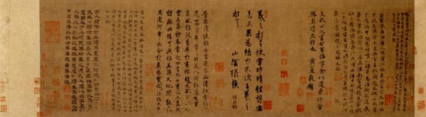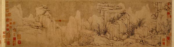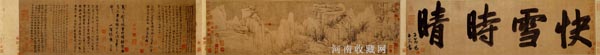 《快雪时晴图》纸本,淡设色,纵:29.7厘米,横:104.6厘米。现藏北京故宫博物院。