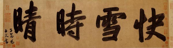 《快雪时晴图》画面除一轮寒冬红日外,该画全以墨色画成,描绘雪霁后的山中之景。通幅用笔柔润如羽,令人称奇的是黄公望竟能运用这种极其柔润的线条建构如此宏大的山石结构,并且使之稳固清晰。