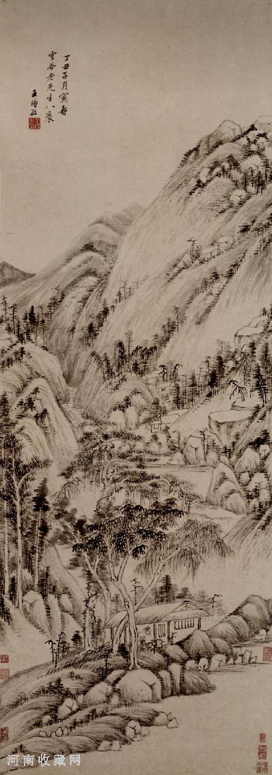 王时敏(1592-1680)〔清〕字逊之,号烟客、懦斋、西田主人、西田遗老、西田老人、偶谐道人、归村老农、稻香庵、西庐老人,江苏太仓人,锡爵孙。明万历二十九年进上,崇祯初以荫仕至太常寺少卿,人称“王奉常”。入清不仕而归隐。淹雅博物,工诗文,善书,行楷得自《枯树赋》,隶书追秦、汉,榜书八分为近代第一。家藏书画甚富,遍摹宋、元诸家名迹,尝择古迹中法备气至者二十四幅,为缩本,装成巨册,以供模楷。更因幼年在董其昌指导下临习古画,加之气质和性格因素,作画唯以自然景象为最高准则,强调“一树一石,皆有原本”。少时与董其昌、陈继儒切磋画理,在研习黄公望山水画上,尤穷其秘奥,晚年益臻神化。平生爱才,王翚、吴历和孙王原祁俱得其指授,对王翚尤奖掖备至。与王鉴、王翚、王原祁合称“四王”,加吴历、恽寿平,称“清六家”,为正统山水画领袖人物。传世作品有崇祯十年(1637)作《云谷乔松图》轴,现藏沈阳故宫博物院;顺治十八年(1661)作《山水图》轴、康熙四年(1665)作《仿王蒙山水图》轴现藏上海博物馆;二年(1663)作《落木寒泉图》轴藏故宫博物院;三年作《拟黄公望山水图》轴藏广东省博物馆;八年(1669)作《夏山飞瀑图》轴藏南京博物院;九年作《云峰树色图》轴、十四年(1675)作《山楼客话图》轴藏天津市艺术博物馆;《仿古山水图册》藏常熟市博物馆。著有《王烟客全集》等。