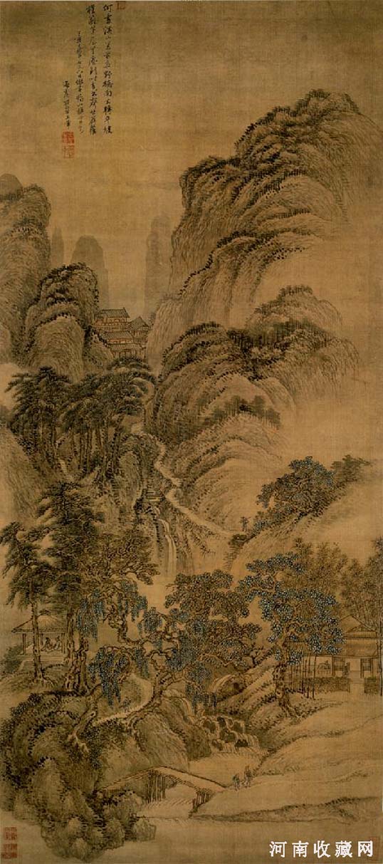 王翚,(1632 -1717),清。字石谷,号臞樵、耕烟散人、清晖主人、乌目山人、剑门樵客,江苏常熟人。嗜画,似有夙慧,运笔构思,天机迸露,迥非时流所能。太仓主鉴游虞山,翚呈画扇,鉴大惊异之,曰“子学造古人”即载之归。先命学古法书数月,乃亲指授古人名迹稿本,遂大进,既而鉴将远宦,乃引谒王时敏。时敏叩其学叹曰:“此烟客师也,乃师烟客耶?”挈之游江南北,尽得观摩收藏家秘本。翚既神悟力学,又亲受二王教,遂为一代作家。时敏每见其业叹曰:“气韵位置,何生动天然如古人竟乃尔耶?吾年垂暮何幸得见石谷,又恨石谷不为董宗伯(其昌)见也。”后鉴见其画,亦叹曰:“石谷乃能至此,师不必贤于弟子,信然”初恽寿平以山水自负,及见翚,度不能及,乃改写生以避之。翚尝奉诏作南巡图称旨。圣祖赐书“山水清晖”四字以宠之,因以自号,内府收藏甚多,得邀睿鉴褒题。家居三十载,侍亲多暇,盘礴不衰,曰:“翚乐此不知疲也”间少不惬,又自讼不置。四方踵求者屦满户外。自刻所与名公卿投赠诗文十卷曰清晖赠言,又尺牍二卷。寿至八十六(一作八十九),死后画益重,有“画圣”之称。他传世的作品很多,如《千岩万壑图》、《溪山红树图》、《种松轩写山水》、《断崖云气图》、《重江叠嶂图》、《石泉试茗图》、《夏木垂荫图》、《唐人诗意图》等。画有南北二宗,翚能冶为一炉,以南宗笔墨写北宗邱壑。惟笔力较弱,且务为富丽繁耨,以投时好,风格苦不甚高,晚年脱落,始多苍茫之致。翚尝曰:“画有明有暗,如鸟双翼不可偏废”又曰:“繁不可重,密不可窒,要伸手放脚,宽闲自在。”又曰:“以元人笔墨,运宋人邱壑,而泽以唐人气韵,乃为大成。”又曰:“余于青绿静悟三十年,始尽其妙。凡设青绿,体要严重,气要轻清,得力全在渲晕。”与王原祁对峙,为清代正统派山水两大宗,学者极众,号虞山派。