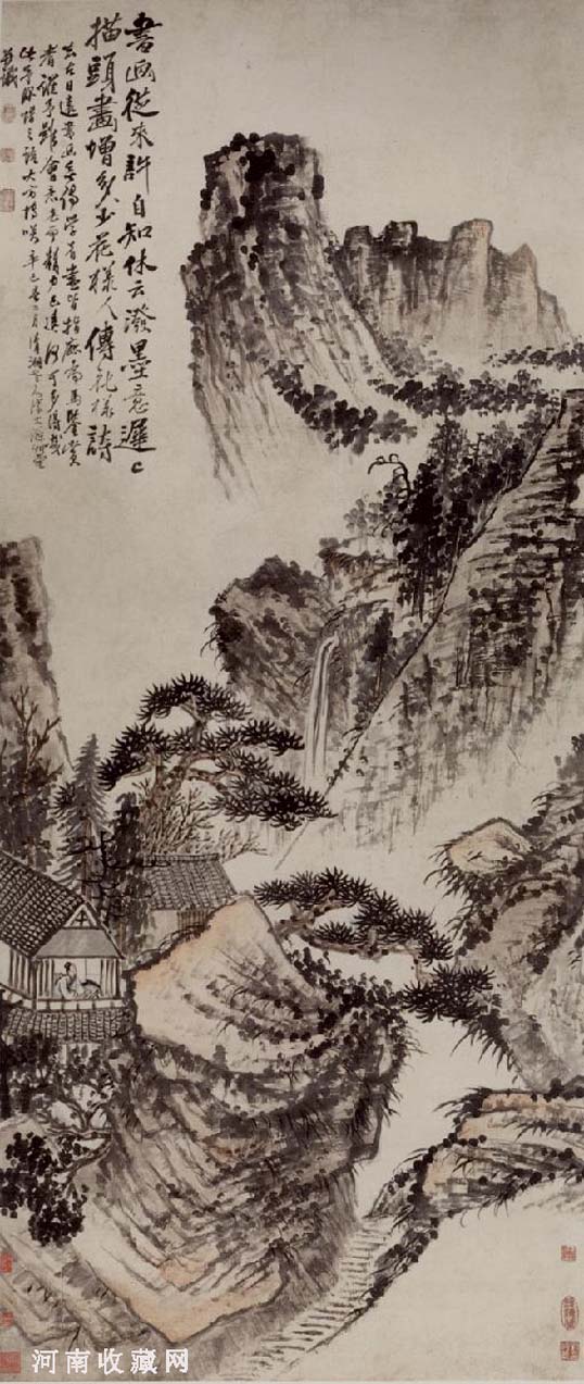 石涛(1630一1724年), 明末清初的“清初四僧”之一。中国清代画家。僧人。本姓朱,名若极,小字阿长, 发为僧后,更名元济、超济、原济、道济,自称苦瓜和尚,游南京时,得长竿一枝,因号枝下叟,别署阿长,钝根,山乘客、济山僧、石道人、一枝阁,他的别号很多,还有大涤子、清湘遗人、清湘陈人、靖江后人、清湘老人、晚号瞎尊者、零丁老人等。明宗室靖江王赞仪之十世孙,原籍广西桂林,广西全州人。其生年有明崇祯九年、十四年、十五年(1636、l64l、1642)诸说,卒年有清康熙四十四年、四十九年、约五十七年(1705、l710、约1718)诸说。明亡后朱亨嘉自称监国,被唐王朱聿键处死于福州。时石涛年幼,由太监带走,出家,法名原济,字石涛,别号大涤子、清湘老人、苦瓜和尚、瞎尊者等,曾拜名僧旅庵本月为师,性喜漫游,曾屡次游敬亭山、黄山及南京、扬州等地,晚年居扬州。他既有国破家亡之痛,又两次跪迎康熙皇帝,并与清王朝上层人物多有往来,内心充满矛盾。(石涛号称出生于帝王胄裔,明亡之时他不过是三岁小孩,他的出家更多的只是一种政治姿态,这与渐江的"受性偏孤"是不同的,石涛的性格中充满了"动"的因素,因而他身处佛门却心向红尘。康熙南巡时,石涛曾两次接驾,并山呼万岁,并且主动进京交结达官显贵,企图出人头地,但权贵们仅把他当作一名会画画的和尚而已,并未与之计较,故而攻败垂成。因此他是在清高自许与不甘岑寂之间矛盾地渡过了一生,好在他聪明绝顶,巧妙地把这种矛盾发泄到他的画作之中,所以他的作品纵横排闼、闪转腾挪,充满了动感与张力,这也正是他异于常人的高明之处。)石涛工诗文,善书画。其画擅山水,兼工兰竹。其山水不局限于师承某家某派,而广泛师法历代画家之长,将传统的笔墨技法加以变化,又注重师法造化,从大自然吸取创作源泉,并完善表现技法。作品笔法流畅凝重,松柔秀拙,尤长于点苔,密密麻麻,劈头盖面,丰富多彩;用墨浓淡干湿,或笔简墨淡,或浓重滋润,酣畅淋漓,极尽变化;构图新奇,或全景式场面宏阔,或局部特写,景物突出,变幻无穷。画风新颖奇异、苍劲恣肆、纵横排奡、生意盎然。其花鸟、兰竹,亦不拘成法,自抒胸臆,笔墨爽利峻迈,淋漓清润,极富个性。石涛的绘画,在当时即名重于世,由于他饱览名山大川,“搜尽奇峰打草稿”,形成自己苍郁恣肆的独特风格。石涛善用墨法,枯湿浓淡兼施并用,尤其喜欢用湿笔,通过水墨的渗化和笔墨的融和,表现出山川的氤氲气象和深厚之态。有时用墨很浓重,墨气淋漓,空间感强。在技巧上他运笔灵活。或细笔勾勒,很少皴擦;或粗线勾斫,皴点并用。有时运笔酣畅流利,有时又多方拙之笔,方圆结合,秀拙相生。