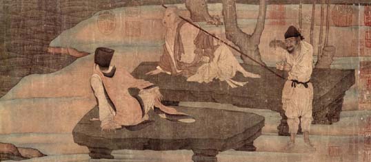 画中有四人,岸上聚三人!石桌坐主人,伯乐与和尚?!