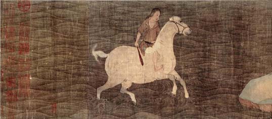 此画的前隔水有金书“韩幹神骏图”五字题签。经比较研究,初步认为是五代摹唐人之作。是工笔画晋人支盾爱马的故事。此图人马用笔极为精练,施重彩而不愿其浓艳,画人马形神统一,树石钩而不皴,水纹浪花尤见功夫。总而言之,此画技法出自唐人,纤巧处露五代画师之风。