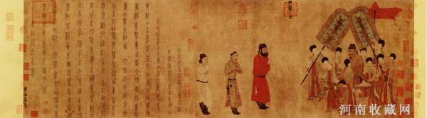从绘画艺术角度看,作者的表现技巧已相当纯熟。衣纹器物的勾勒墨线圆转流畅中时带坚韧,畅而不滑,顿而不滞;主要人物的神情举止栩栩如生,写照之间更能曲传神韵;图像局部配以晕染,如人物所著靴筒的折皱等处,显得极具立体感;全卷设色浓重淳净,大面积红绿色块交错安排,富于韵律感和鲜明的视觉效果。此图一说为宋摹本,但摹绘较精,仍不失原作之真。幅上有宋初章友直小篆书有关故事,还录有唐李道志、李德裕“重装背”时题记两行。