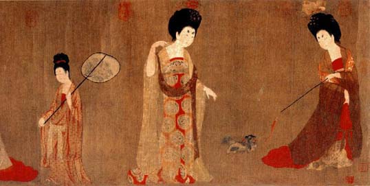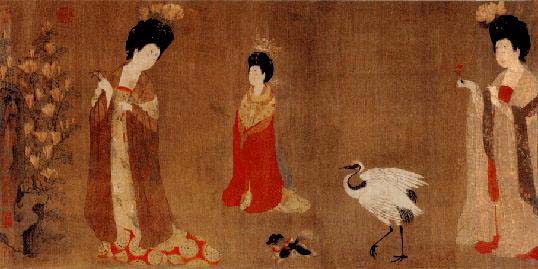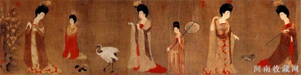 《簪花仕女图》,绢本设色,唐代画家周昉作,用笔朴实。气韵古雅。现藏辽宁省博物馆,描写贵族妇女春夏之交赏花游园的情景,画面描绘仕女们的闲适生活。她们华丽奢艳在庭院中游玩,动作悠闲、拈花、拍蝶、戏犬、赏鹤、徐行、懒坐、无所事事,侍女们持扇相从。其赋色技巧,层次明晰,面部的晕色,衣着的装饰,都极尽工巧之能事。轻纱的透亮松软,皮肤的润润光泽,都画得肖似,表现出作者具有高度的艺术技巧和概括能力。