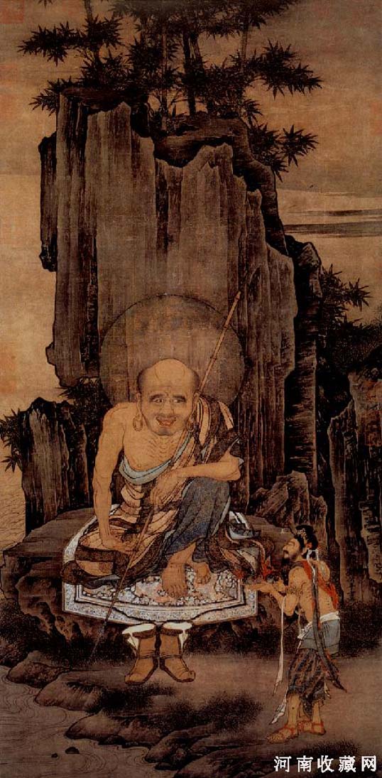 刘松年(约1155-1218),南宋孝宗、光宗、宁宗三朝的宫廷画家。钱塘(今浙江杭州)人。因居于清波门,故有刘清波之号,清波门又有一名为“暗门”,故其俗呼为“暗门刘”。宋孝宗淳熙年间(1174-1189)入为御前画院学生,宋光宗绍熙年间(约1190-1194)为画院待诏,宋宁宗时(1195-1224)因进献《耕织图》,得到奖赏,赐予金带。擅画人物、山水,师张训礼(本名张敦礼),而名声盖师,被誉为画院人中“绝品”。画学李唐,画风笔精墨妙,山水画风格继承董源、巨然,清丽严谨,着色妍丽典雅,常画西湖,多写茂林修竹,山明水秀之西湖胜景;因题材多园林小景,人称“小景山水”。张丑诗云:“西湖风景松年写,秀色于今尚可餐;不似浣花图醉叟,数峰眉黛落齐纨。”所作屋宇,界画工整。兼精人物,所画人物神情生动,衣褶清劲,精妙入微。作品题材广泛,既有反映社会不平的,如《风雪运粮图》;松年也是位爱国画家,拥护抗金,反对投降,曾苦心孤诣画《便桥会盟图》,希望统治者效法唐太宗战胜强敌突厥,而不要效法唐高祖之逃跑投降政策;他还画《中兴四将图》,表彰岳飞、韩世忠等民族英雄之伟绩。后人把他与李唐、马远、夏圭合称为“南宋四大家”。传世代表作品有:《四景山水图》卷及《天女献花图》卷,现藏故宫博物院;开禧三年(1207)作《罗汉图》轴和嘉定三年(1210)作《醉僧图》轴,现藏台北故宫博物院;《雪山行旅图》轴藏四川省博物馆;《中兴四将图》卷传为其所作,藏中国历史博物馆;传世作品还有《西湖春晓图》、《便桥见虏图》、《醉僧图》等。著有《溪亭客话》。