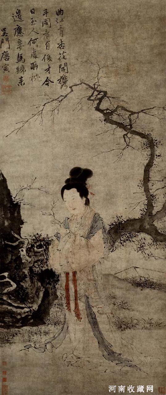 唐寅(1470-1523),明代画家。字伯虎,一字子畏,号六如居士、桃花庵主、逃禅仙史等,吴(今江苏苏州)趋里人。人们大多从戏剧故事中领略了他的不少风流韵事,以为他似乎活得十分洒脱、享乐,其实他一生屡受挫折,郁郁寡欢,最终54岁早逝。他和文徵明同一年生,与文徵明少年时的迟钝相反,唐寅却是自幼聪敏机灵。文徵明27年中考了10次乡试,都名落孙山;而唐寅29岁开始应乡试,却一举博得第一名解元,声名远布。第二年赴京会试,不想卷入科场舞弊案,被株连入狱,革去功名。这对他无异是极大的打击。前途无望,妻子离异,他变得自暴自弃,开始沉湎声色,放荡不羁,自称“江南第一风流才子”。但他心犹未死,游历四方,等待时机。正德九年(1514),江西宁王朱宸濠遣人四方网罗人才,文徵明拒绝了,但唐寅却去了。半年多后,唐寅还是看清了朱的蓄谋叛逆之心。于是佯装痴狂,终被遣归。从此似乎看破了红尘,皈依佛教,自号“六如居士”(如梦、幻、泡、影、露、电)。虽然被后人评为“明四家”之一,但他的画,却远不如文徵明那么受追捧,生活清苦,但他仍放纵声色,不多年也就在凄楚孤苦中去世。而文徵明比他多活了36年,桃李满天下,俨然吴门画派的领袖。