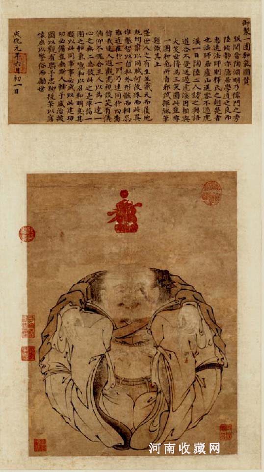 朱见深(1448-1487)〔明〕宪宗皇帝,英宗长子,宣宗孙,在位二十三年。工书画,尝为张三丰写像,神采生动,超然尘表。《珊瑚网》载有宪宗山水小景。尝画《一团和气图》,取虎丘三笑故事,将陶渊明、陆修静、惠远法师三人合为一体,构思独特而巧妙。自赞曰:“伟者达人,遐观高视,谈笑有仪,俯仰不愧,合三人以为一,达一心之无二,忘彼此之是非,蔼一团之和气。噫!和以召和,明良其类,以此同事事必成,以此建功功必备。岂无斯人,辅予盛治。披图以观,有概予志。聊援笔以写怀,庶以警俗而励世。”此图运用滑稽形象来警俗励世,堪称我国存世最早之漫画,另有《岁朝佳兆图》轴,两画均藏故宫博物院。