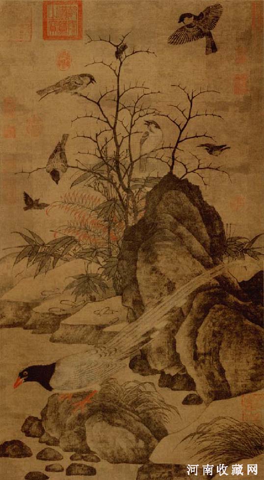 黄居寀(933-993以后),四川成都人,字伯鸾,五代十国名画家黄筌之子。初为西蜀孟昶(934-965在位)朝翰林待诏,为宫廷作画。乾德三年(965)随蜀主降宋,进京供职宫廷,负责收罗和鉴定名画,淳化四年(993)曾出使成都府。太宗尤加宠遇,委以搜访名画,诠定品目之重责。黄筌父子之画艺,在北宋初期尚成为图画院评定优劣之标准。《山鹧棘雀图》描绘山鹧临流饮水,溪岸坡石长有荆棘、竹、蕨、野草,荆棘上有四只山麻雀,另有三只飞禽,似表现远处飞鸟,其画法与风格较为特殊,是否黄居寀之笔,仍待考。