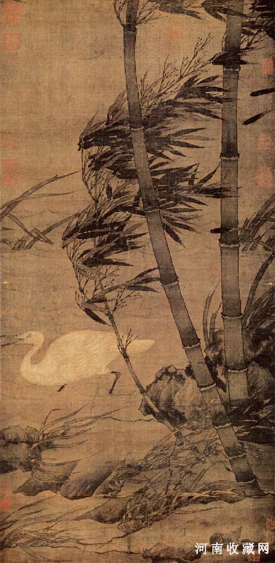 崔白,字子西,濠梁(今安徽凤阳东)人。熙宁初,诏与艾宣、丁贶、葛守昌等画垂拱殿御扆鹤竹各一扇,崔白最为出色,于是补为图画院艺学。然而崔白性情疏放,执意辞却,但不允,也就只得勉强接受。他擅画花竹、禽鸟,注重写生,精于勾勒填彩,设色淡雅,别创一种清淡疏秀的风格。功力深厚,作画不勾草稿,而能“曲直方圆,皆中尺度”。 《竹鸥图》中一头白鸥一面叫着一面逆风逆流,涉水前行,水滨的竹和草都可以看出风吹之劲。从这幅画可以看出崔白善于描写与运动关联的花鸟生活,而不是一些静止的形象。