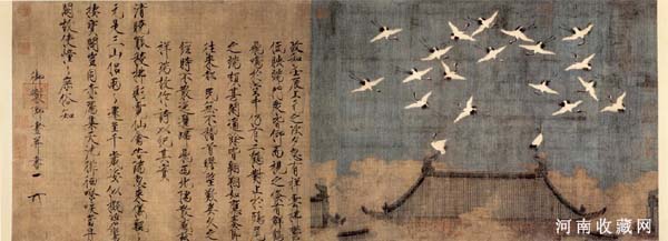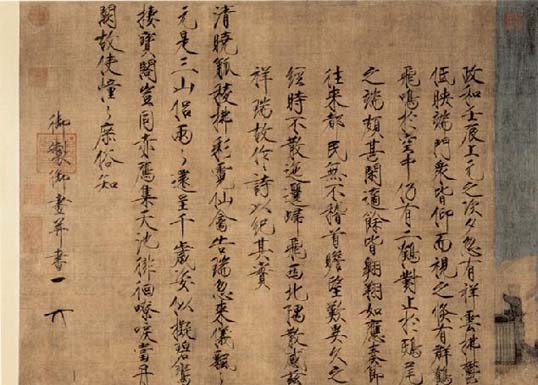 赵佶自幼钟爱书画。据蔡绦《史补》云:“上在藩潜时,独喜读书学画,工笔札,所好者,古器、山石,异于诸王。”做了帝王之后,依然淡薄权欲,痴迷艺术,对美的追求近乎苛刻。他曾说:“朕万机余暇,别无他好,惟好画耳。”[2] 在书法方面,他学褚遂良,薛稷的瘦劲,然后再秉之以风神,出之以飘洒,卓然自成一家,自号“瘦金体”,犹如冲霄鹤影,掠水燕翎,高迈不凡而又轻盈无迹。其笔势飘逸,意度天成,飘飘乎宛若仙风道骨。南宋楼钥曾目睹过徽宗真迹,称其“笔力超迈,高掩前古,自出机杼,真书禊序于青缯中,虽日出于薛稷,而楷法精妙,何止青出蓝而已”,还说他的字“至今如新,势欲飞动。”