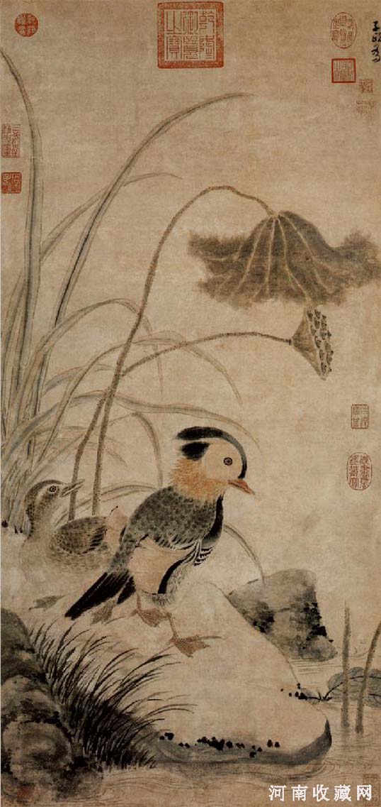 《枯荷鸂鶒图》纸本,浅设色,纵96.4厘米,横46厘米。现藏台北故宫博物院。该幅虽属设色作品,但以墨为主,鸳鸯略加颜色点染,鲜妍可爱,颇具淡雅之趣。枯荷断茎,画有倒影,为古画中少见。此画题款由左而右书写,极为特别。按理,原来应有“子政为某某人”等字,后经裱褙裁去,故仅存“子政为”三字。