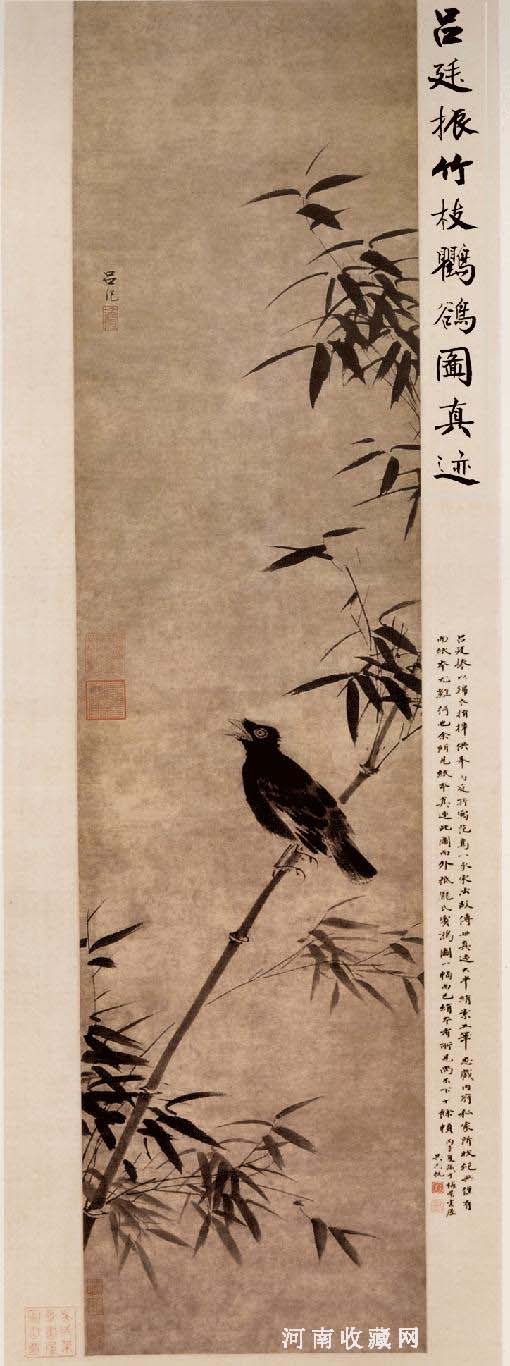 吕纪(1447一?),字廷振,号乐愚,一作乐渔,四明(个浙江宁波)人。孝宗弘治中供事仁智殿,官锦衣卫指挥。初学边文进, “作禽鸟如凤、鹤、孔雀、鸳鸯之类,俱有法度,设色艳丽,生气奕奕”,是画院中严守绘画法规的作家。每逢“承制作画”,总是“立意进规”,孝宗尝称道之: “工执艺事以谏,吕纪有之。”他的传世作品不少,工笔着色与水墨写意兼能,并善于将两体结合。此外也偶作山水人物。是明代与边景昭、林良齐名的院体花鸟画代表画家。