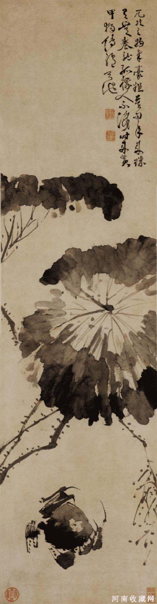 徐渭(1521—1593)明朝,山阴(今浙江绍兴)诸生。所居在绍兴城内,有一枝堂、柿叶堂、青藤书屋等。工画残菊败荷,炉瓶彝鼎之属,皆古质淡雅,别有风致。兼绘山水,则纵横不拘绳墨。画人物极其生动,醉后拈写字败笔作拭桐美人,即以笔染两颊,而丰姿绝代,转觉世间铅粉为垢。此无他,盖其笔妙也。凡求书、画者,须值其匮乏时。投以金帛,顷刻立就。若囊钱未空,虽以贿交,终不可得。行草书仿米氏,笔意奔放如其诗,苍劲中姿媚跃出。不论书法而论书神,诚八法之散圣,字林之侠客也。尝自评云:「吾书第一,诗二,文三,画四。」朱彝尊谓其诗与文皆未免繁芜,不若画品,小涂大抹,俱高古也。闽督胡宗宪于嘉靖三十七年(一五五八)招致幕府,渭故知兵好奇计,擒徐海诱王直皆预其谋。并为胡草献白鹿表,极为世宗所赏。后以胡被逮自杀,精神失常,蓄意自杀,击头、鎚耳、碎肾囊均不死,又击杀其后妻,入狱,后为张元忭营救出狱。晚年著书鬻画。卒年七十三。有诗文全集,又著路史分释、古注参同契十余种。