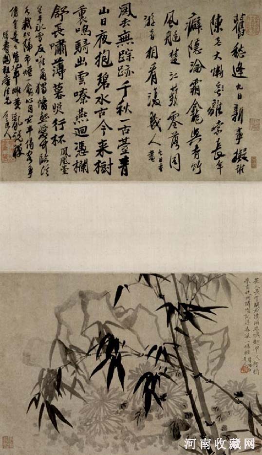 石涛于康熙46年(1707年)与世长辞,在最后的岁月中,他还能以苍劲流利的画笔画出最后的一些作品。作于康熙44年乙酉(1705年)的《梅竹图》(上海博物馆藏)为其中之一。此图以罗纹纸作画,由于半生半熟的纸质特点,画面达到了湿润而不漫漶的笔墨效果,更兼用笔清逸流畅,构图巧妙,把梅干、枝枒、花瓣、花蕊及寥寥数枝的竹枝得体地画于各个部位,是件文人画意趣浓厚的作品。