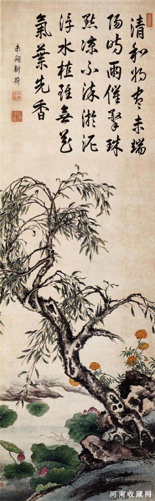在中国古代社会中,很多人同时身兼官吏、学者、诗人、画家等多重身份,有着广泛而深厚的修养并积极人世,蒋廷锡就是其中非常典型的一位。也由于这种原因,蒋廷锡的绘画因素繁杂,颇耐人寻味。清代张庚在《国朝画征录》中评之:“以逸笔写生,或奇或正、或率或工、或赋色或晕墨,一幅中恒间出之。”蒋廷锡—般被认作是宫廷画家,作品题材往往高雅脱俗、寓意祥瑞,幅面偏大,且风格富丽堂皇,多署“臣”款,以供御用。蒋廷锡亦有文人气息非常浓厚的作品传世。他深受障南田影响,并从游于恽之弟子栖霞道人马元驭。他的画除没骨法之外,还常常勾勒敷彩,使画面花红羽翠;也常施墨笔,富贵庄重又不乏恽氏娇媚。其勾花点叶,尽显写意风流。