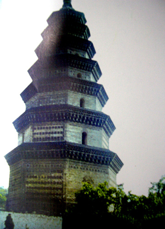 福胜寺塔初建于隋,北宋天圣十年(公元1032年)重修,为八角七级仿楼阁式砖塔,高38.28米。塔身全部用青砖垒砌,自下而上逐层递减。塔内第一、二、三层有梯,可盘旋而上或凭梯斜上,四层以上则无梯可攀。每层塔体都有圆形塔心室,四层至七层塔室联为一体。塔身每层内外壁都嵌砌有各种砖雕2000