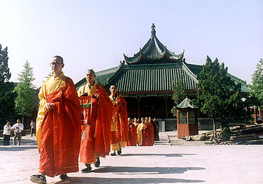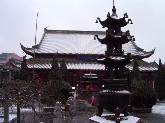 大相国寺的寺名是赵朴初题写的,大门前的游人实在太多,想拍张照片等了好久也未能如愿,只好把游客都当作背景摄入镜头了。进门就见两侧的钟、鼓楼,晨钟暮鼓,所有佛教寺院建制都雷同。所不同的是,大相国寺铜钟重达5吨,是清朝乾隆年间的遗物,上铸“法~轮常转,皇图永固”、“帝道暇昌,佛日增辉 ”等字样。“相国霜钟”系汴京八景之一。