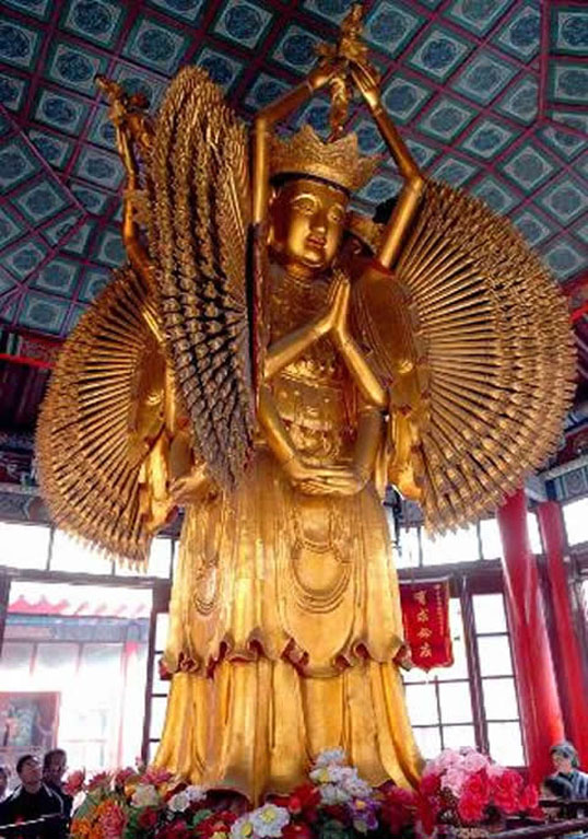 登上十来米高的殿堂,四周是汉白玉月台及石栏,栏杆上镂刻的石狮精巧异常。殿内三世佛背后是大型雕塑南海观音,寓意普渡众生。第三座佛殿罗汉殿有其独特的建筑,被称为八角琉璃殿,在佛教寺院中是独一无二。正中是一院,有八角亭耸立,3米多高的四面千手千眼观音菩萨像金壁辉煌。我曾见识过无数千手千眼观音,而这四面的观音还是第一次见到。