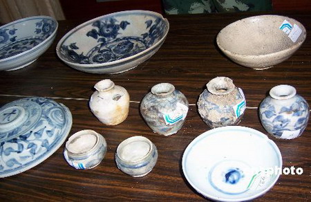 广东省南澳县云澳海域发现大批古瓷和一艘千年古沉船。目前,广东省有关专家初步将沉船命名为“南海二号”。图为发掘的部分瓷器。中新社发 李瑞丹 摄