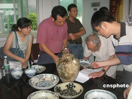 广东省南澳县云澳海域发现大批古瓷和一艘千年古沉船。目前,广东省有关专家初步将沉船命名为“南海二号”。图为有关专家对发掘的古磁进行鉴定。中新社发 李瑞丹 摄