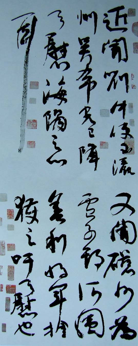 我的书作中,有件临颜真卿《刘中使帖》的作品,在参加1992年河南书协举办的第三届中原书法联展大赛的展厅里,引起不少书家的注目,事后收藏家多次登门求购我都爱不释手,欲终生藏之。此作品所成,既偶然,也非偶然,但是虽是 一挥而就不过十几分钟时间,然而促成的因素却是多方面的。