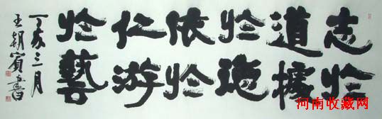 宛若一个远行者,王朝宾先生身背碑刻法帖的行囊,从古典走来。对他来说,古典碑帖是此岸,古典碑帖又是彼岸。即便是在他功成名就之后,在他以古典为依傍已建立起属于自已的独特行书、楷书和隶书话语文本之后,他仍然将追寻古典法帖的精髓作为他艺术人生、人文关怀的极终目标。就是在前几天,我有幸拜读了王先生近年所临写的《十七帖》、《怀仁集圣教序》、《孔宙碑》、《曹全碑》、《杨淮表记》及大量金文墨迹,同时也读到了他创作的楷书大中堂,行书、隶书四条屏,大草条幅、长卷。其中甲申、乙酉两年所临摹、创作的作品多达数十件。细读临摹作品,对古典法帖的风格特征,精气神的把握虽不能说已臻出神入化、“下笔便到汉人处”之化境,然而醇厚、浓郁的古典气脉,正化作“绕指柔”在其作品中流淌。而创作作品中的楷书似可见“浓墨宰相”之气;隶书可彰汉碑的中和、清通气脉;行书则有何子贞三昧;草书似有几分醉意,颇存怀素遗法。孙其峰先生评王朝宾先生小草、章草书“典雅醇厚”,隶书得“书卷气、庙堂气”,当为贴切中肯。孙先生还说:“在他(指王朝宾先生)写的几种书体中,写得最好的当首数隶书了。”从目前我读到的作品看,其隶书、楷书、行书和草书似难分伯仲。其小草、章草典雅醇厚之气息更纯,隶书书卷气、庙堂气之外似乎又平添了纯净、清通之韵,楷书的大度雍客,行书的宠辱不惊和大草的畅酣淋漓构成了他书法审美风格的坦荡情怀。