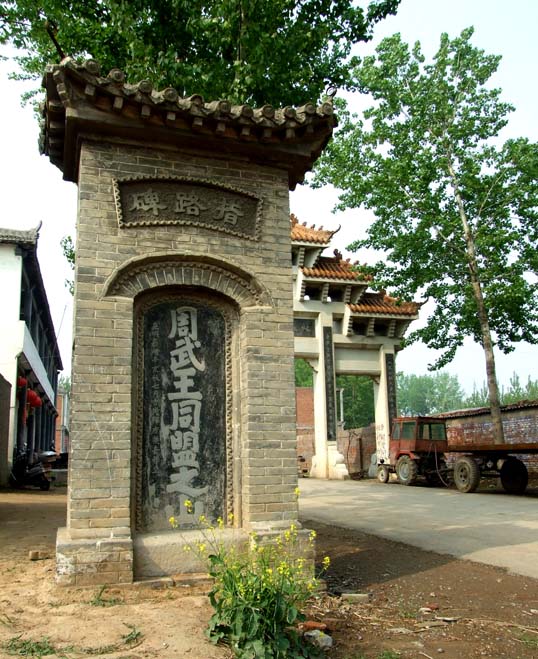 周武王同盟山位于河南省新乡市获嘉县东北3公里处,有一高20米的土台,面积约3.75万平方米,即“同盟山”,上建武王庙。庙左有太公校阅台,右有饮马池。《获嘉县志》记载:“同盟山在县东北五里,相传武王伐纣与诸侯同盟于此。”清代《重修周武王庙碑记》载:“邑之东北七里许有土岗。韩诗外传:周武王伐纣之时大会孟津,戌午渡河,遂于此观兵焉。故左有校阅台,右有饮马泉。”说明周武王伐纣时曾路过这里,并在此修武练兵,故修庙以志纪念。武王庙始建于周末,元末毁于兵火战乱,明代重建,清至民国多次修葺。武王庙南北长175米,东西宽100米,轴线建筑自南至北有山门、拜殿、后殿和东西配殿、厢房。庙内现存历代碑刻20余通,唐代槐树一株。武王庙现存建筑大多为清代所修,后殿(即玉皂殿)为明代建筑风格。