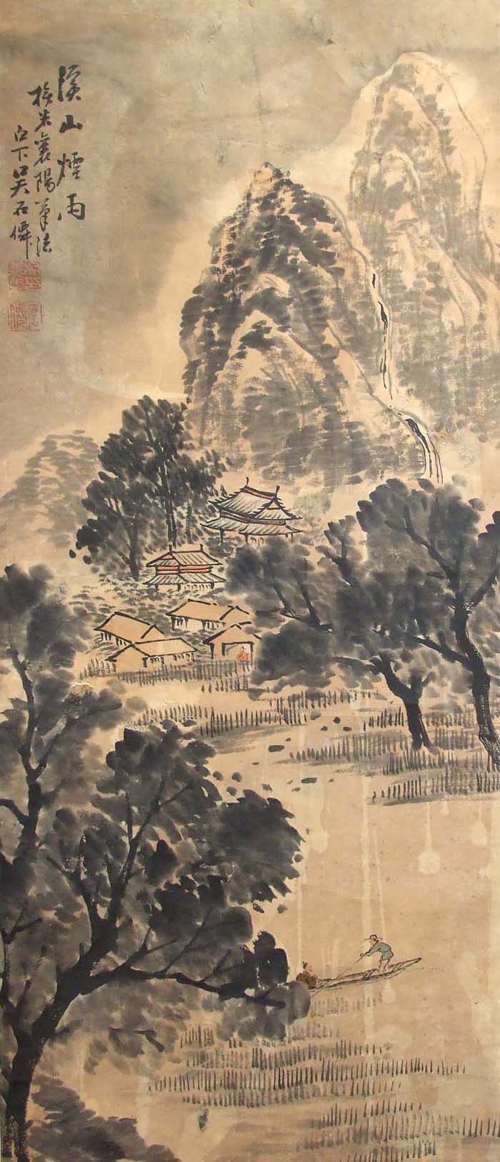吴石仙(1845-1916)名庆云,字石仙,后以字行,晚号泼墨道人。上元(今南京)人,流寓上海。擅长山水,长于雨景,能出新意。近代海派著名的画家。代表作品有《海州全图》、《通景四屏》、《远寺夕照图》、《秋景山水》。