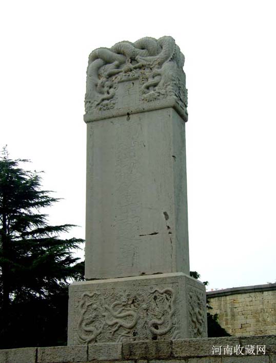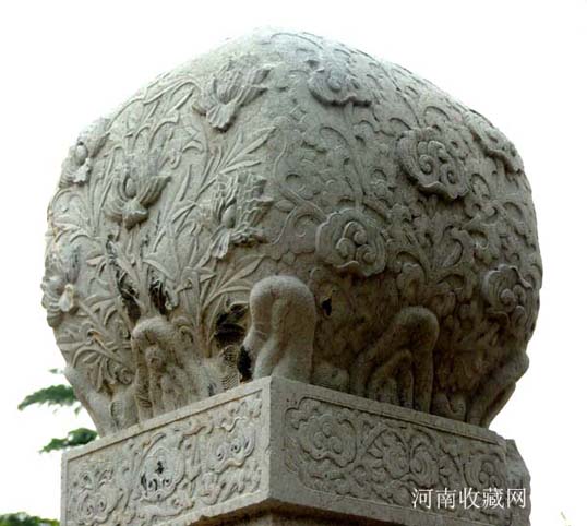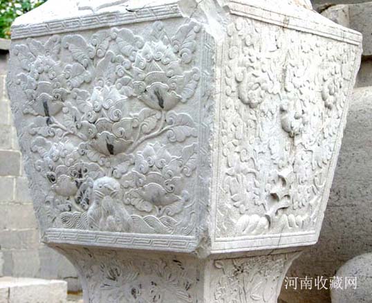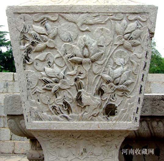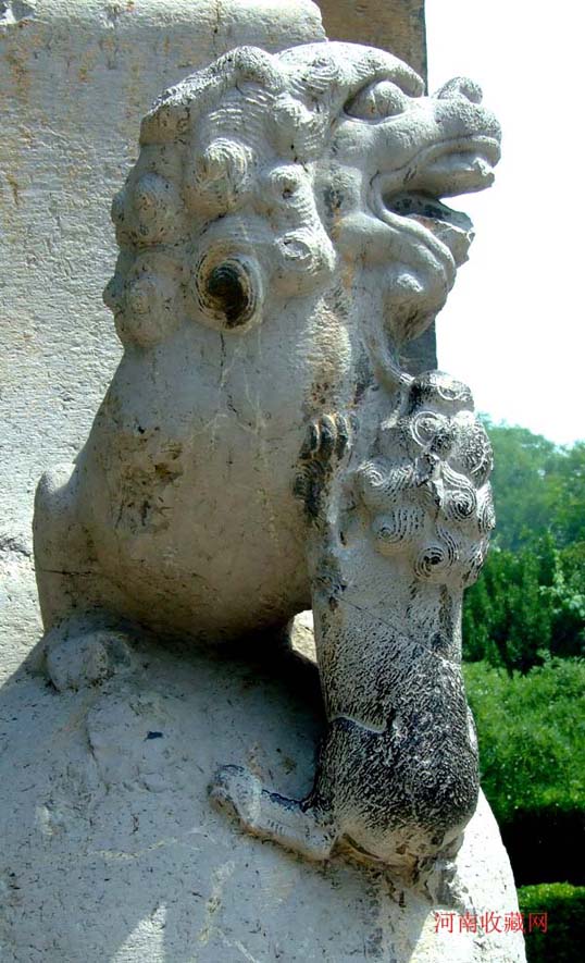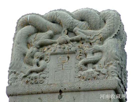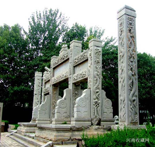 石坊两侧分别立方形华表一对 , 为石刻仪仗的标帜。华表各相距牌坊 1.73米 , 通高 5.42 米 , 其中华表柱身高 4.25 米 ,056 × 056 米见方 , 四面均饰高浮雕巨幅云龙宝珠图案;其底座高 0.78 米 ,0.92 × 0.92 米见方, 刻成束腰状 , 束腰部分饰以莲花瓣两层 , 其余部分皆镌刻花卉。华表柱顶部原有圆雕异兽 , 均面朝南呈昂首高吼状 , 现已毁坏。