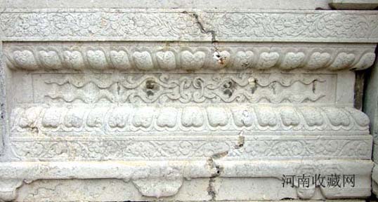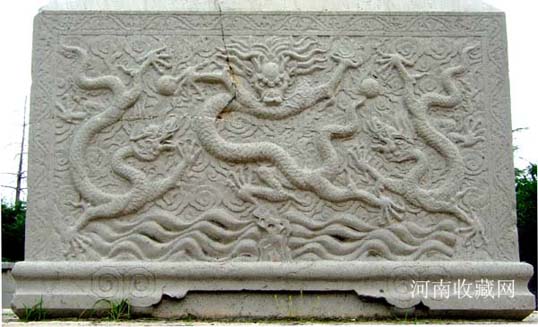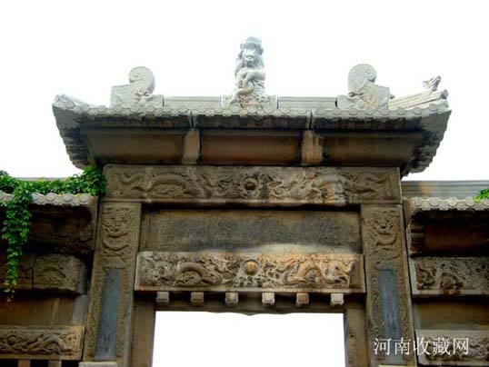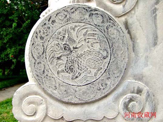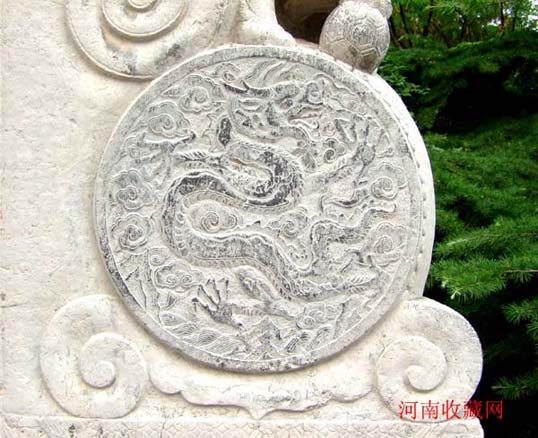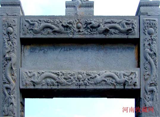 在明间额板正反两面用线刻置径尺楷书“潞藩佳城 " 四大字。明间顶部正中以圆雕形式 刻双龙盘立,系大额枋一石雕成,可惜已经残毁,仅存部分龙尾,似乎仍在游动。四周环绕精美的浮雕龙饰,巨型石梁铆榫严丝合缝,体现了我国古代石匠精湛的手艺。