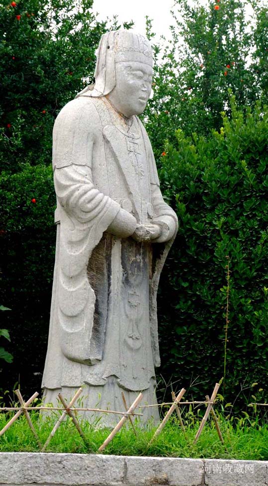 控马宫一对, 未分男女 , 身高 2.45 米 , 座 0.66 × 0.90 米见方。东侧者右手牵着马 , 左手提马鞭;西侧者左手牵马 , 右手提马鞭 , 两者均紧*马的南边;控马宫各自着春秋季节长袍 , 纹饰朴素简明。头戴素纹官帽 , 腰间系镶玉腰带 , 上身几乎无有装饰 , 下部廖廖几笔 , 勾画出衣纹数道 , 笔法简练而效果却极佳 , 面部凝重但显得年青、精力充沛。