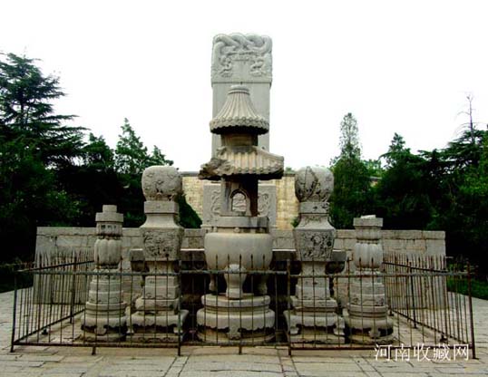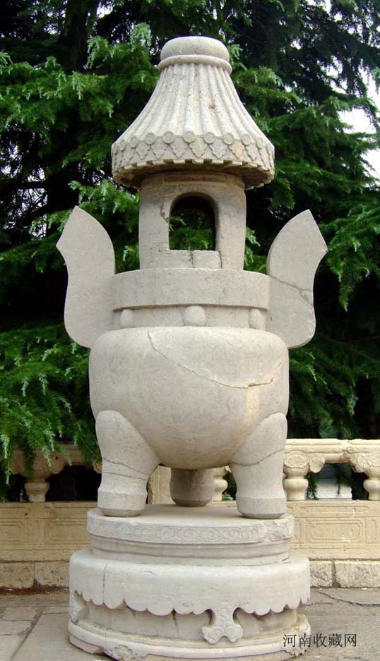 供案前放置的高大石雕 “五供”, 即香炉一个 , 花瓶二个 , 烛台二个。此 “五供 ”之高之大 , 造型之奇特 , 在北京的十三陵中也未见到。香炉高近 4 米 , 造型主体为一圆鼎 , 双耳 , 炉顶雕成建筑物形状 , 上圆下方 , 双重檐 ;下檐为四角攒尖 , 上檐为园形攒尖顶 , 园脊、戗脊、瓦垅、猫头、滴水一应俱全 , 造型独特、别致。