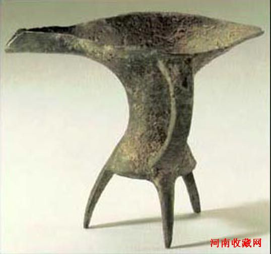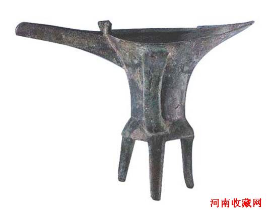 商代早期,通高14.5厘米 流至尾长19.5厘米。盛酒器,其流窄长,尾尖,有加厚的唇边,流尾有一对小柱,长束腰,浅鼓腹,平底,下有三棱锥状足,一侧有鋬,半圆形带镂孔,腹壁较薄,质朴无纹。这是我国现知最早的青铜时代文化——二里头期的典型器。