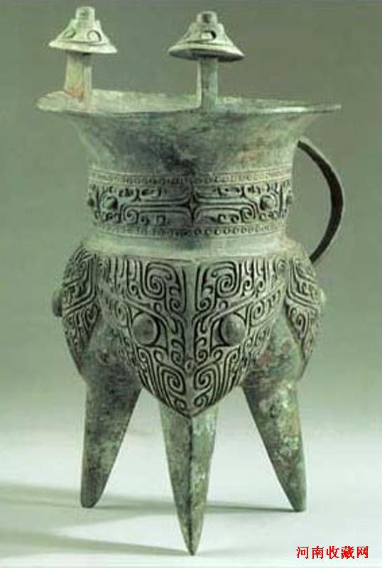 商代中期(公元前16-前14世纪) 斝是古代盛酒器,兼作祭神的祼器,是中国最早的礼器之一。此器敞口高颈,前有双柱作帽形,下有三锥足,足部与器腹相通。袋足的作用是为了在温酒时扩大受火面积,所以有温酒的作用。器物的颈、腹部各饰兽面纹。腹部兽面纹,双目突出,带有神秘感。此器形体高大,器壁匀薄,在口沿上有一周加厚的唇边,形成商代早中期青铜器的铸造特色。