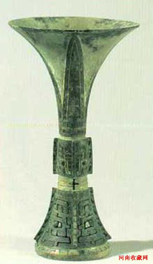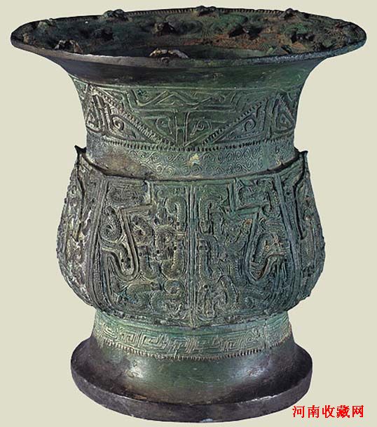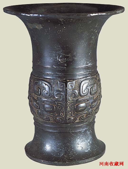 商代晚期(公元前13世纪-前11世纪) 觚是饮酒器。此器喇叭口,高圈足,中间细腰可以把手。口部和颈部饰三角形变形兽纹,中腹部饰两组对称的龙纹。尤为特殊的是在圈足上的曲角龙纹采用透雕的样式,装饰性极强,同时也显示出极为高超的铸造技术。