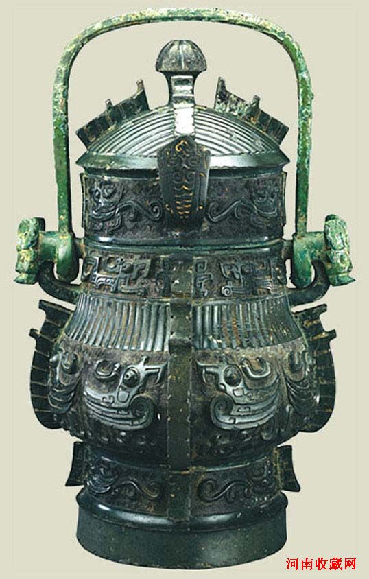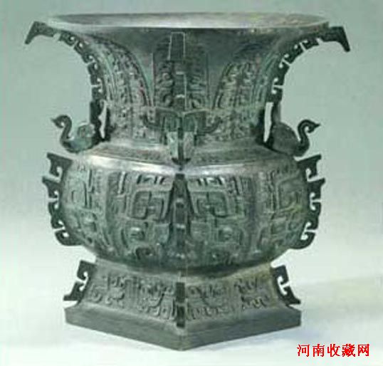 商代晚期(公元前13世纪-前11世纪) 这是一件大型的盛酒器,整器自上而下装饰了六段花纹,以腹部为主干纹样,分三段:上段作鸟纹;中部为一锐牙裂口,形状猛烈的巨大兽面纹;下段也作兽面纹,唯形象与中部不同。全器纹饰以云雷纹为地,主干纹样粗壮突出,极有气势。器的每面中线及四角均出棱脊,使器物更为稳重庄严。