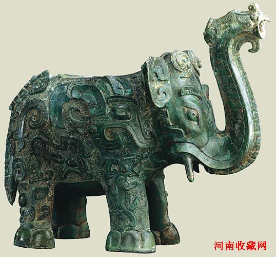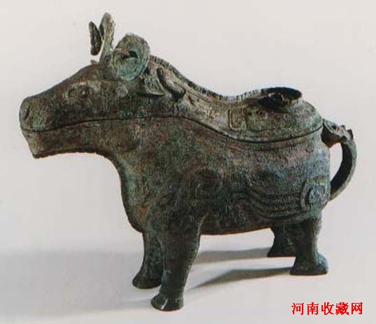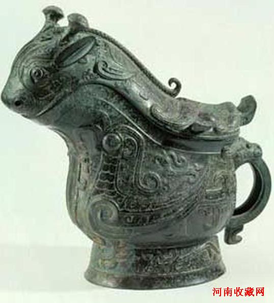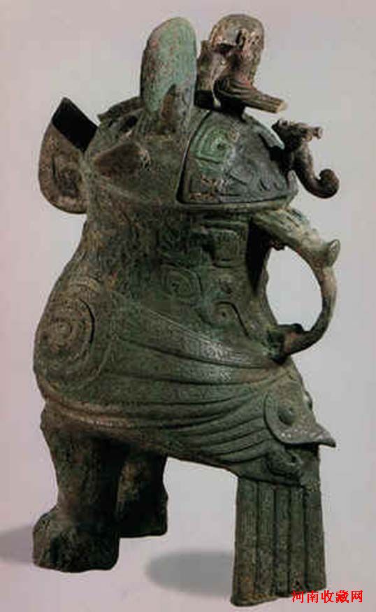 商代,高22.8,长26.5厘米。作象形,象鼻与腹相通,可作流口,背上有椭圆形口,酒可以从此注入,是一件既具艺术,又具实用有铜器。
