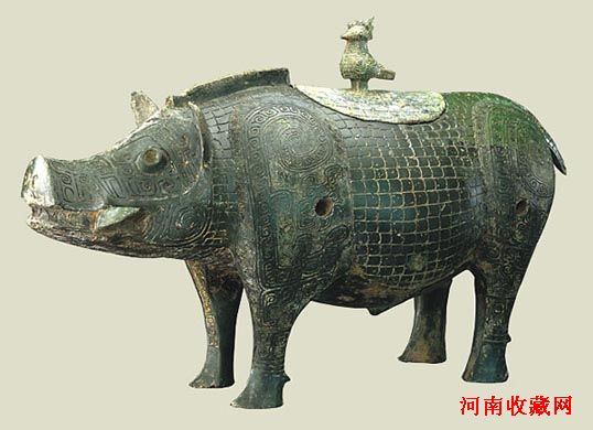 商代,高40,长72厘米。为酒器,猪背上开椭圆形口,设盖,腹内盛酒