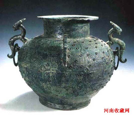 战国,通高30.5厘米 口径20.3厘米 底径18.2厘米。盛酒器,此器敛口、折沿、短颈、圆肩、平底,腹上部铸带有活环的兽耳一对,小兽躬身攀壁,回首翘尾。两耳间另饰一兽形扉棱,器身布满绦索纹构成的网格,格中填满细密的羽纹,纹间许多圆涡,内中镶嵌物已脱落。