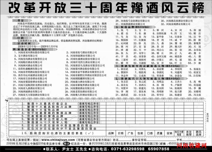 一、背景:河南是中国酒的发源地,历史悠久,灿烂辉煌。自1978年改革开放三十年来,豫酒走过了不平坦的发展之路,从辉煌到陷入低谷,现又走上了振兴发展之路,涌现了不少值得回忆和总结的人与事。为总结历史,开创未来,再创豫酒辉煌,河南省酒业协会与大河报联合开展“改革开放30周年豫酒十大最具价值企业、十大最具影响力品牌、十大强势品牌、豫酒突出贡献人物、豫酒振兴十大领军人物”评选推介活动。 二、目的:弘扬豫酒历史文化 提升豫酒品牌品质 营造豫酒消费氛围 再创豫酒世纪辉煌 三、活动时间:2008年12月中旬——2009年1月中旬