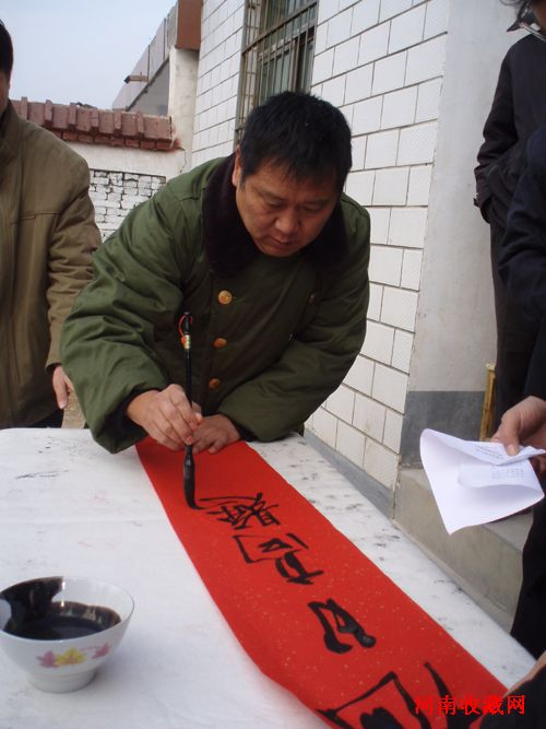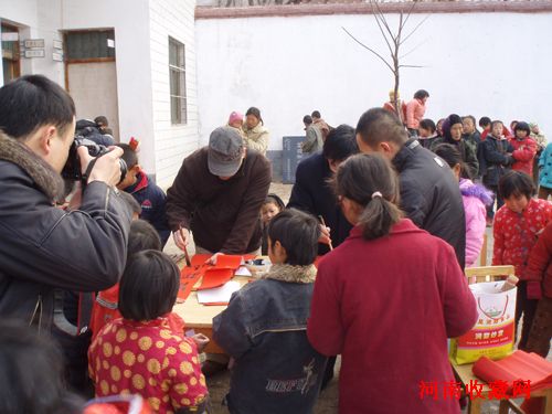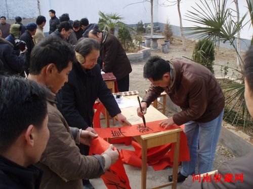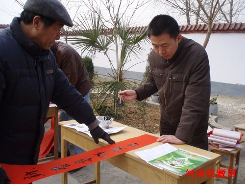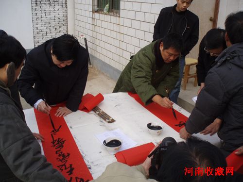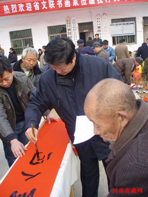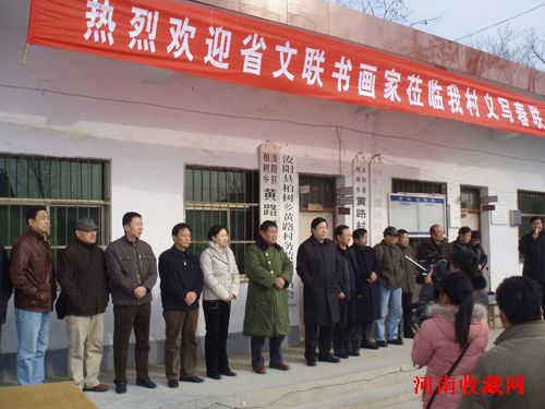 为了把党的温暖和关怀送到贫困群众家中,结合当前进行的深入学习实践科学发展观活动, 使艺术家们的创作更好地坚持“三贴近”,12月26日,省文联主席、省美协主席马国强,省文联副巡视员张剑锋,省书协主席兼秘书长宋华平,省美协副主席兼秘书长刘杰,省美协副主席兼省书画院院长谢冰毅等20余位著名书画家到汝阳县柏树乡黄路村,为贫困山区的广大农民朋友义写春联,拉开了省文联今年“送欢乐、下基层”活动的序幕,这也是省文联组织书画家第三次到黄路村为农民朋友义写春联,受到了大家的热烈欢迎。