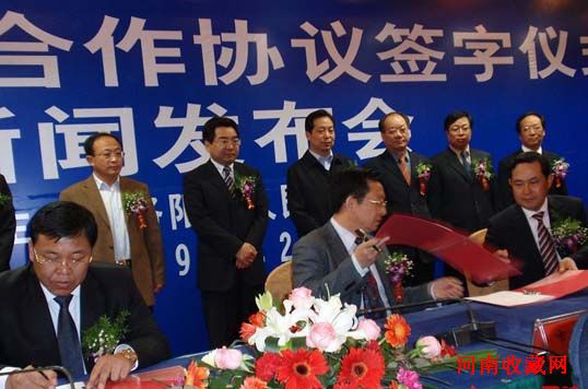 洛阳市人民政府、河南杜康投资集团和百瑞信托有限责任公司三方代表正在杜康战略合作协议书上签字