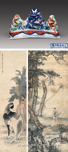 青花瓷以其清新雅致取悦于人,雍容者有清雍正青花缠枝莲纹盘口尊、精美者有清雍正青花缠枝莲纹抱月瓶;大气者有明万历青花万寿纹大罐;珍稀者有明洪武青花缠枝牡丹双耳盘口瓶;身披迂回交错纹理的是清乾隆哥釉五孔瓶;明万历的青花五彩龙纹笔山、清乾隆青釉四方水盂、清雍正的仿哥釉双耳洗、明代茶晶笔架、可见古人文房的精彩;从红山文化的玉箍形器到清乾隆的白玉碗、白玉凤首衔环尊、白玉释迦摩尼坐像、和田玉巧作三色挂件,件件都显示出玉文化的源远流长。