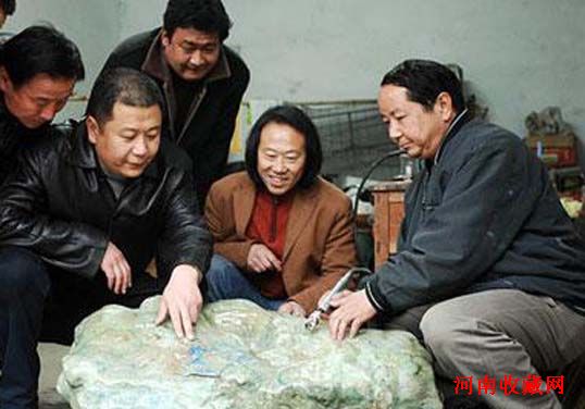 收藏者张文力(左三)与鄂西北地质矿产调查所专家陈启敏(右一)等人一起鉴赏绿松石