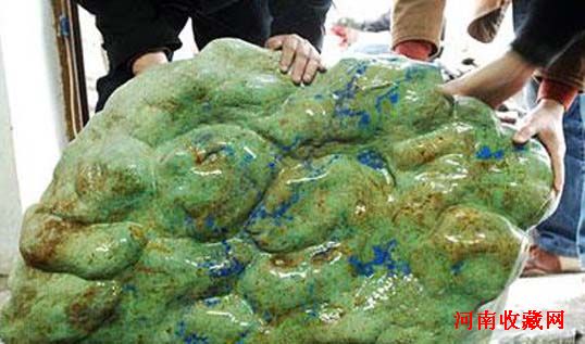 前不久,湖北襄樊的收藏爱好者张文力从湖北竹山县一老乡家中收购了一块长约100厘米、高约60厘米、厚26厘米、重210公斤的绿色石块。经湖北省鄂西北地质矿产调查所专家陈启敏鉴定,该石块为罕见的绿松石珍品,具有极高的观赏价值。