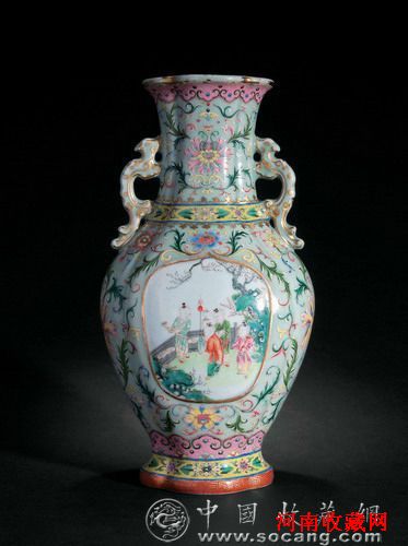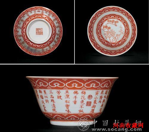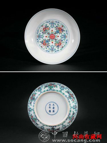 瓷器部分仍以传统官窑为主。青花、五彩、斗彩……异彩纷呈。如豆青洋彩婴戏开光海棠瓶为乾隆朝典型官窑器。其通体施青釉,釉色温润,开光以洋彩绘婴戏图案。器物保存完好,器形罕有,为乾隆御窑精品。洋彩这一名称源于清宫造办处档案,为粉彩、珐琅等诸多施以西洋进口彩料瓷器的总称。随着研究的不断深入,洋彩器的神秘面纱也不断被揭开。本品以洋彩描绘人物故事,形神皆具且以双耳海棠瓶造型为载体,保存至今尤为难得。乾隆矾红御题诗文三清杯,杯体外壁为矾红御制诗文,并装饰梅花、佛手和松枝。为乾隆帝本人亲自设计交由督窑官唐英所烧制。为当时众多御窑创新器之代表佳作。充分体现了乾隆皇帝本人的文人雅趣。青花八宝纹大碗,亦是乾隆御窑精细之杰作。外绘缠枝纹莲花,勾描工整,莲上托八种宝物隐喻八仙,青花发色青翠,体型硕实,不可多得。嘉靖五彩云鹤寿桃纹大牌,体型硕大,五彩发色明快,彩绘之下兼有暗刻。嘉靖信奉道教,本次的五彩云鹤寿桃纹大盘,题材取于道教文化,盘心以矾红绘变形符咒寿字。仙鹤寿桃皆为福寿喻意,用以表达长寿、祈福的美好意愿。本品彩绘保存基本完整,通体云鹤的画法尤为难得,体量巨大,甚为罕有。当为嘉靖官窑少见之精品。