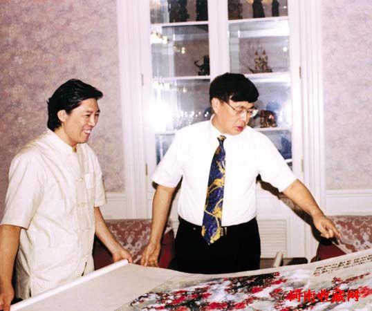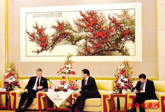 中共中央政治局委员、国家商务部部长薄熙来在河南黄河迎宾馆梅花厅张志泉巨幅作品前接见外国客人。